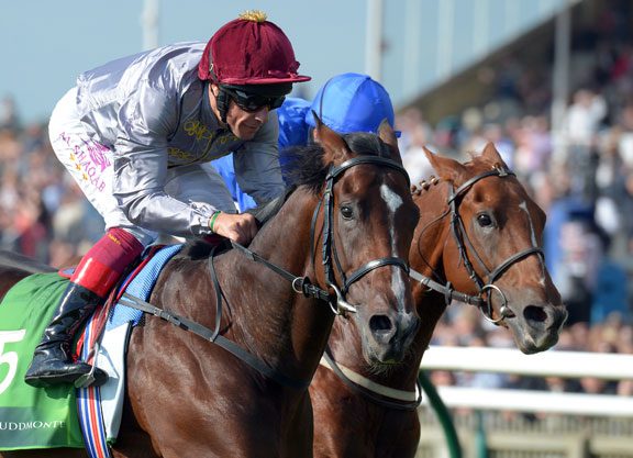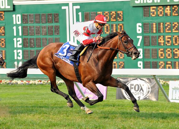 With plenty of help from his table-setting stablemate Shining Copper (Aragorn {Ire}) Saturday, Ken and Sarah Ramsey’s Big Blue Kitten (Kitten’s Joy) scurried home in course record time of 2:23.39 to take Belmont’s GI Joe Hirsch Turf Classic, a “Win and You’re In” qualifier for the GI Breeders’ Cup Turf Oct. 31. Slumber (GB) (Cacique...